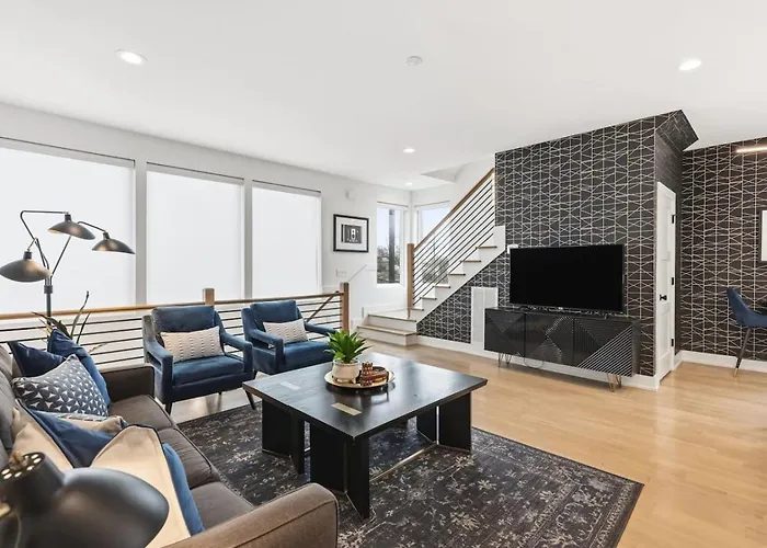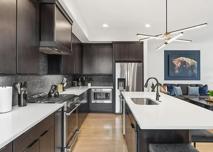 US$ 526 price for 1 nightMore detailsCheck rates - Stylish 4Bed Retreat With Rooftop, Garage, Peloton, Sleeps 12, Fire Table, Gourmet Kitchen, Cozy Living Space, Dedicated Parking, Near Distilleries, Marathon Village And Nightlife, Chic Skyline Views, 24 Hour Hospitality