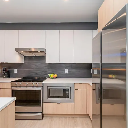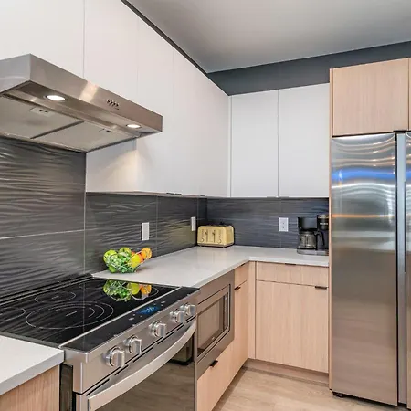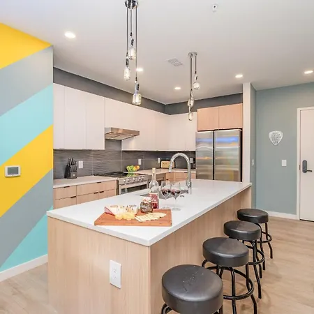 In an equipped kitchen at Hyve - Neon Lights - Pool & Gym - Walk To Broadway Villa, there are a fridge, oven, and a kitchenware. The nearby Party Fowl is located 0.3 miles away. Thanks to 8th Ave s & Division st Nb bus stop, located only a 5-minute walk away, guests can easily explore Nashville.