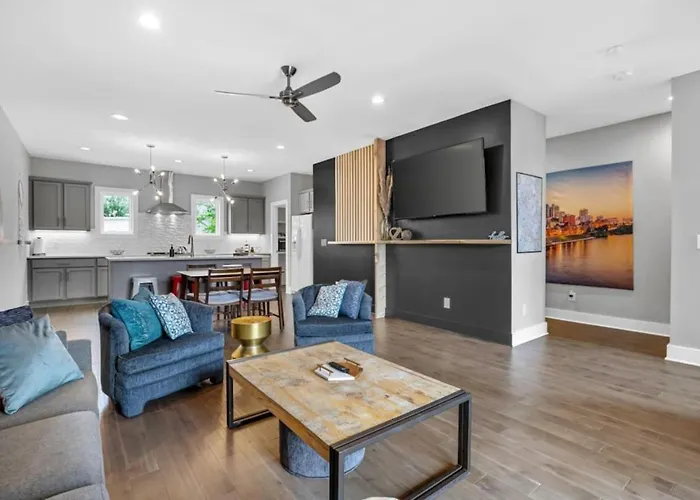 Nashville International airport can be reached within 15 minutes drive, and natural attractions like Bicentennial Capitol Mall State Park are approximately a 25-minute walk away. Music City Walk of Fame Park is nestled 2.2 miles from this Nashville villa, and Top Golf is 1.1 miles away. The villa offers sports enthusiasts to discover Nissan Stadium, located about a 10-minute drive away.