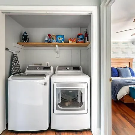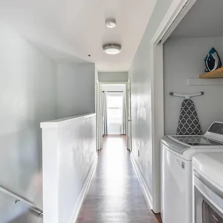 Walk To Broadway Charming Modern Historic Townhome villa comes with a bathroom with a washing machine. There are hairdryers, bath sheets, and towels for guests' comfort.